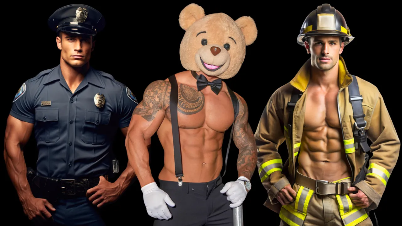 Choose from over 100 outfits—firefighters, police officers, doctors, cowboys, seductive nurses, CEOs, military, construction workers, mariachi, pizza boy, UPS, lawyer, and more.